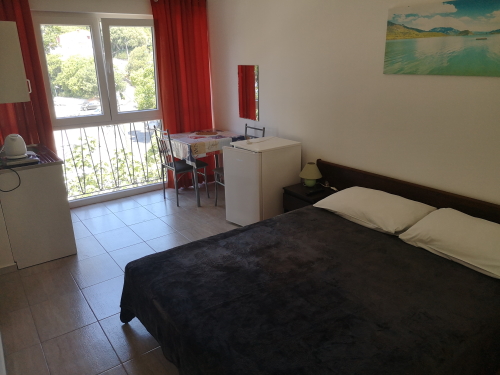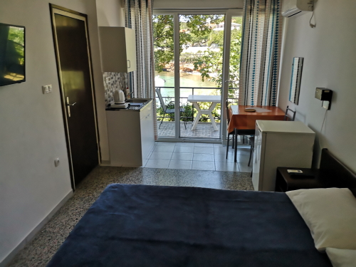 First row and completely open to the sea, we have a newer house with rooms and a studio apartment, the perfect setup for couples, clean and comfortable, and a 3 star rating. Each space is ideally suited for couples (2 people), includes 3-piece washroom, air-conditioning, satellite television, wireless Internet access, and room safe. Rooms are located on the upper floors and have balconies, while the studio is located on the ground floor and has a patio. The studio additionally includes a kitchenette and refrigerator intended for light cooking, while rooms have access to a shared refrigerator in the common area (no common kitchen). Private parking is available in front, spaces are limited, but street parking is nearby.